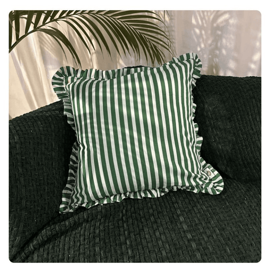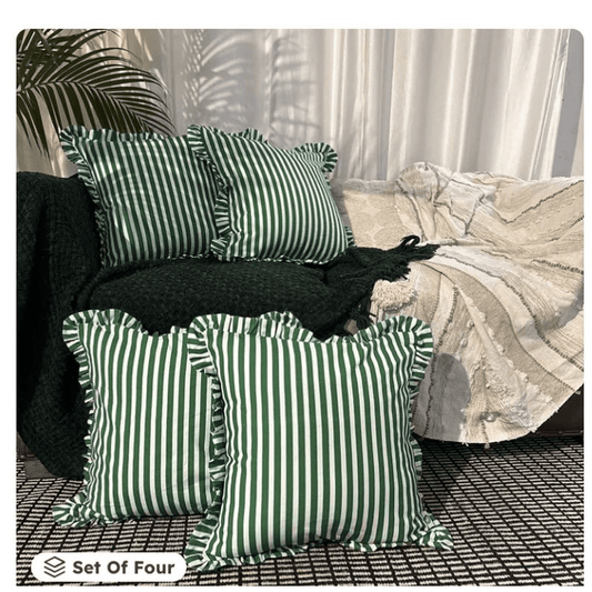 GREEN STRIPED RUFFLE PRINTED CUSHION – ELEGANT COTTON DECOR PILLOW SET OF 4 PCS