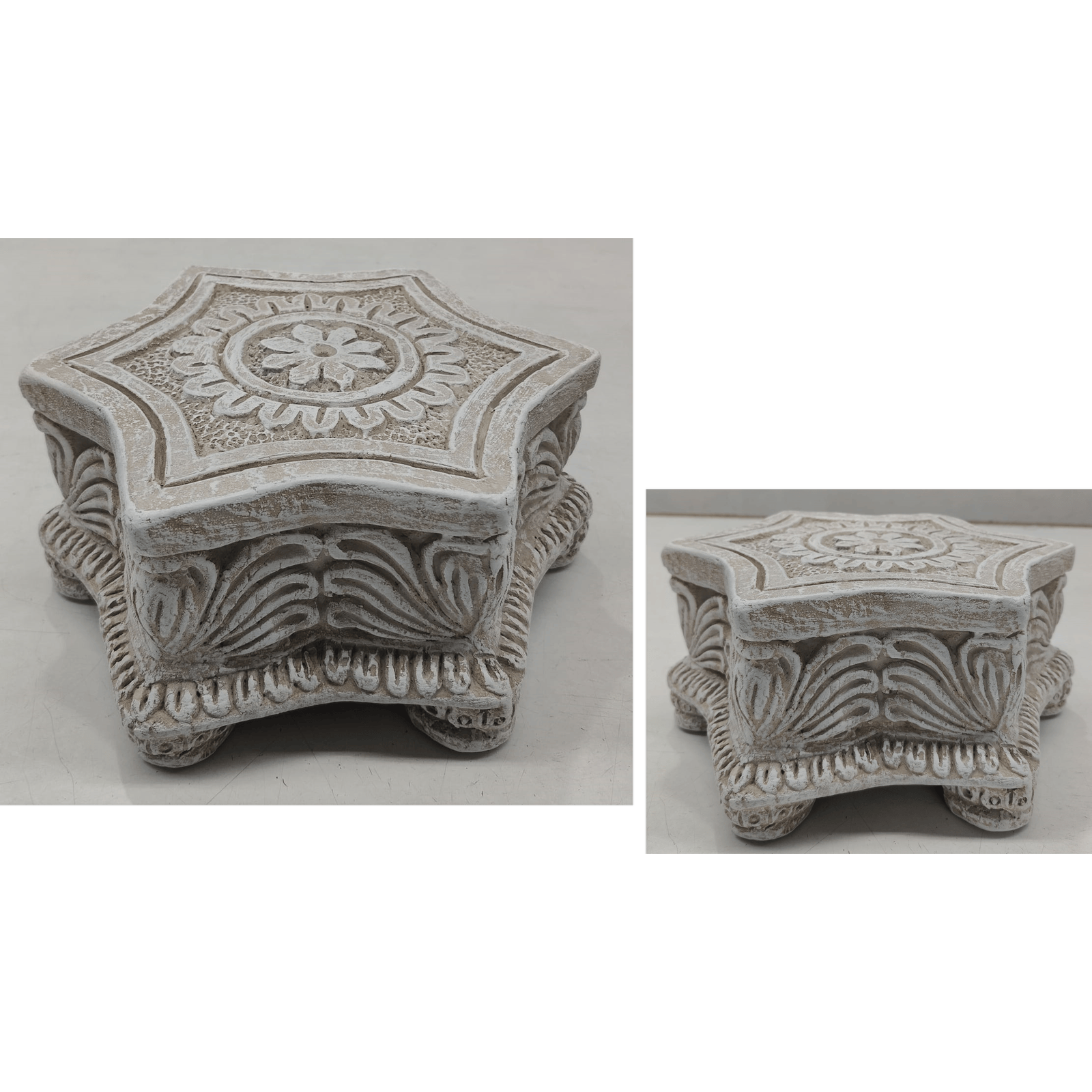 Enhance Your Décor With This Exquisitely Handcarved Wooden Pedestal, Designed In A Unique Star Shape And Finished In A Beautiful Rustic Whitewash. Crafted By Skilled Artisans, The Top Features An Intricate Floral Carving Surrounded By Detailed Texturing, While The Sides Showcase Deep, Ornate Leaf Motifs That Add Depth And Richness To The Design.