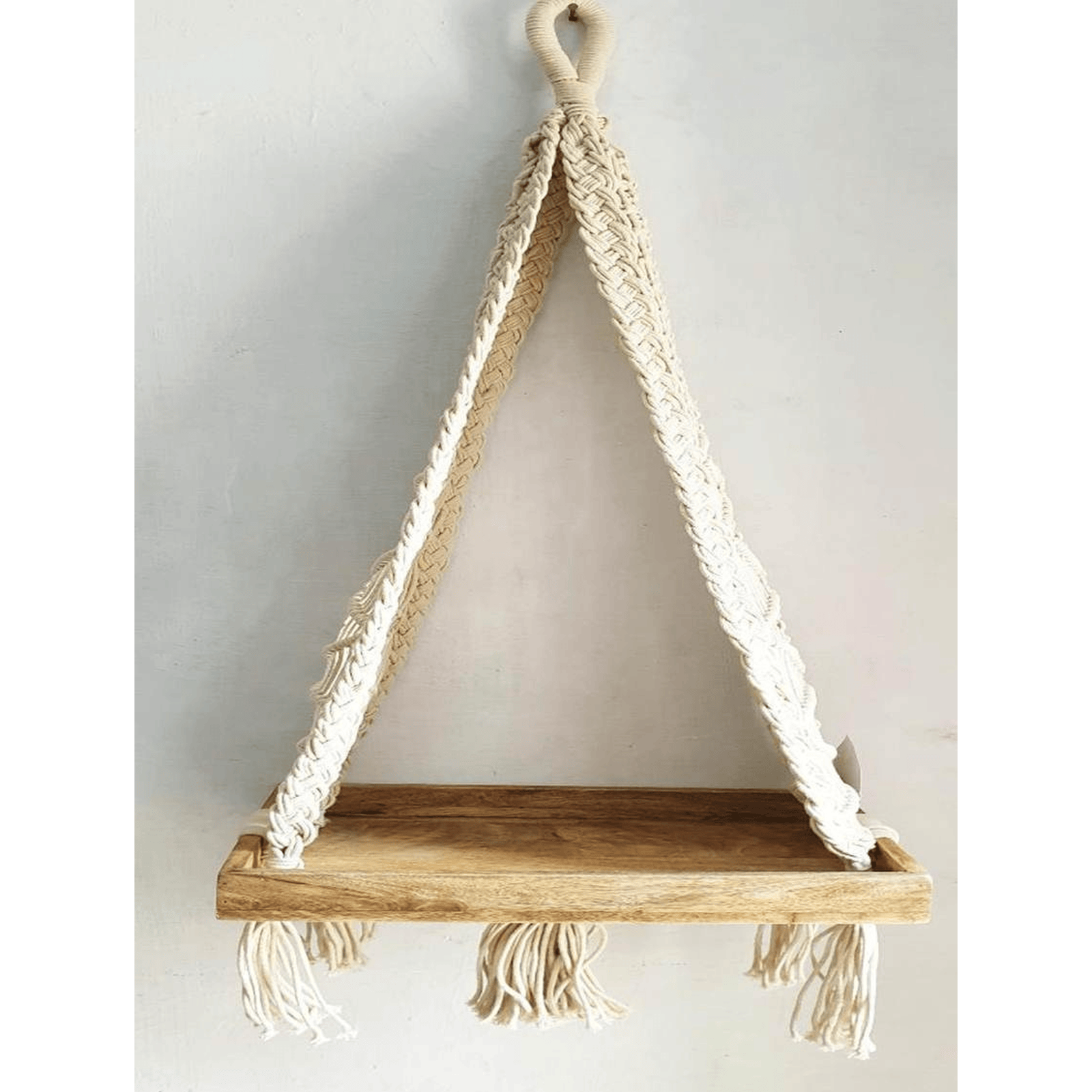 The Wide, Flat Wooden Shelf Offers Ample Space For Displaying Plants, Candles, Books, Photo Frames, Or Small Décor Accents. The Sturdy Macramé Straps Provide Excellent Support While Adding A Decorative Boho-Inspired Appeal. Finished With Soft Tassels Below The Shelf And A Secure Wrapped Hanging Loop At The Top, This Shelf Makes A Stylish Yet Functional Statement In Any Room.