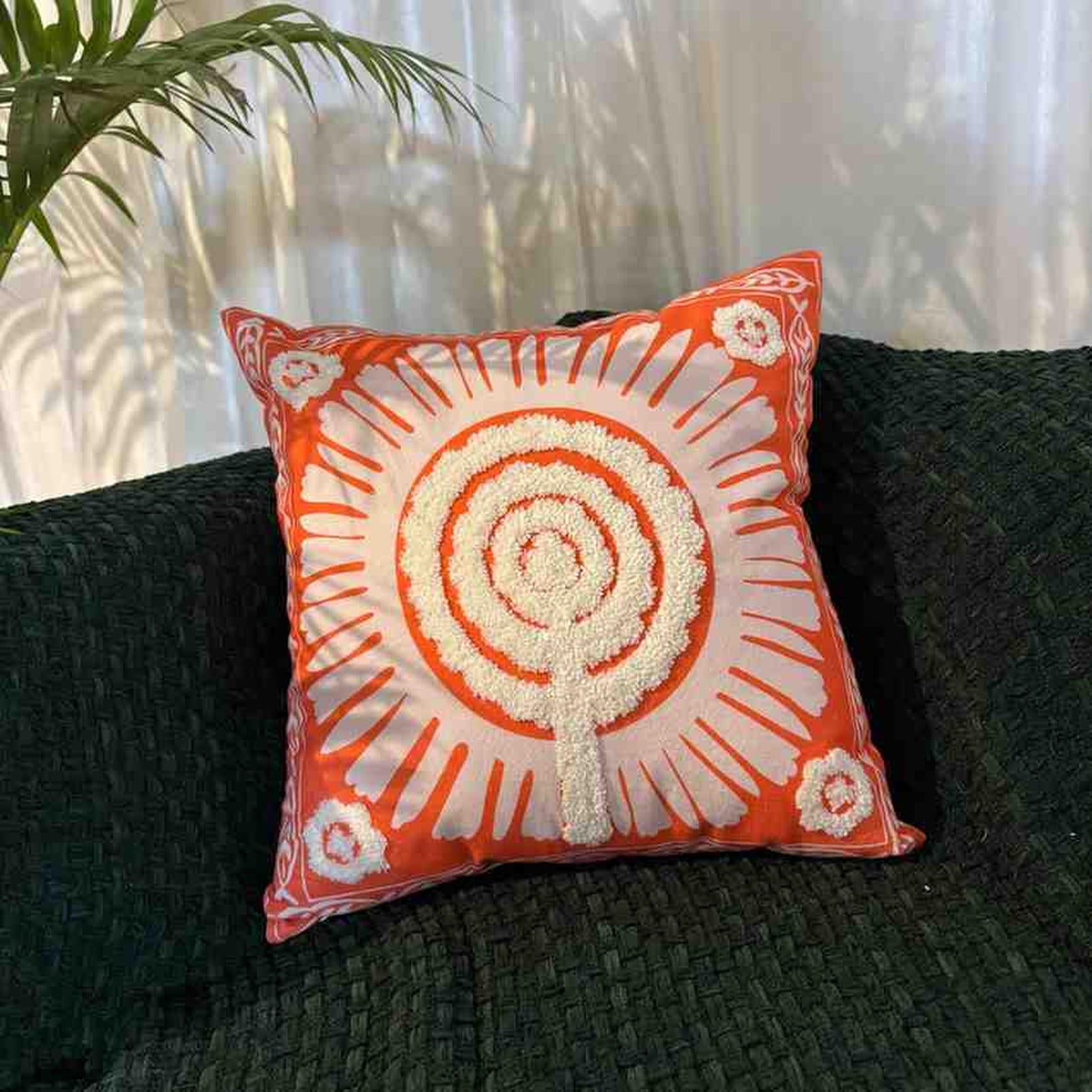 Add A Burst Of Vibrant Elegance To Your Living Space With This Stunning Tufted Cushion. Featuring A Bold Orange Base Accented With An Intricate White Tufted Circular Motif, This Cushion Brings A Perfect Blend Of Artistry And Comfort. The Detailed Embroidery Along The Edges Enhances Its Handcrafted Charm, Making It A Standout Piece For Sofas, Accent Chairs, Or Bedrooms.