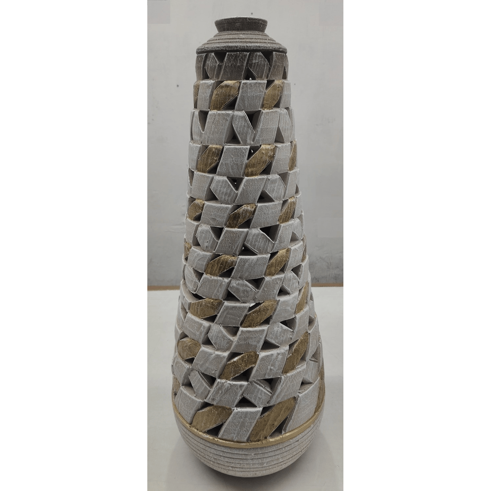 Elevate Your Home Décor With This Stunning Handcrafted Terracotta Vase, Designed To Be A True Statement Piece. Its Tall, Tapered Silhouette Is Beautifully Adorned With An Intricate Woven-Style Texture, Blending Natural Terracotta Tones With Hand-Finished White And Golden Accents. The Detailed Cut-Work Pattern Creates Depth, Dimension, And An Artistic Sculptural Look That Stands Out In Any Space.